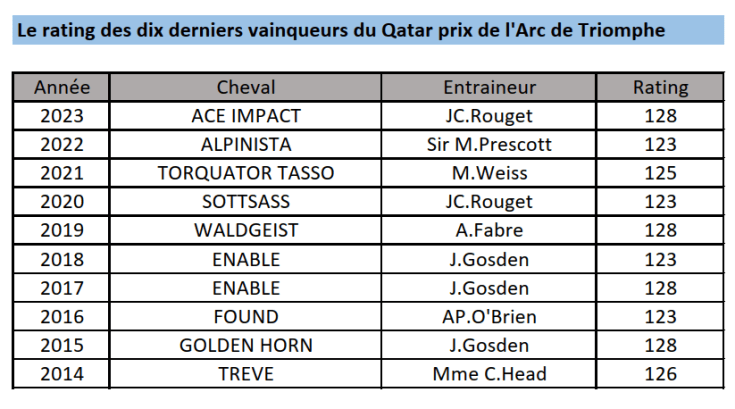 ACE IMPACT fait 128 après avoir fait 123 dans le Qatar Prix du Jockey Club (Gr1). C’est le meilleur rating depuis 10 ans à égalité avec WALDGEIST, GOLDEN HORN et le premier Arc d’ENABLE. C’est pour l’instant le meilleure performance d’un cheval européen cette année, meilleur 3 ans au monde et deuxième mondial derrière EQUINOXE.