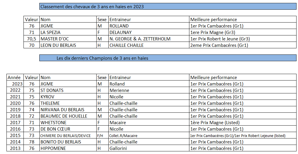 Titulaire de cinq victoires et une troisième place en six sorties, Jigme est le meilleur 3 ans sur les haies. En effet, il a remporté très facilement le Prix Cambacérès (Gr1), affichant un rating de 76. Vainqueur du Prix Magne (Gr3), La Spezia est deuxième avec une valeur de 71. En troisième position, nous avons Master d’Oc, gagnant du Prix Robert Lejeune (Gr3) avec un rating de 70.5. Véritable métronome au plus haut niveau, Leon du Berlais, 2e du Prix Cambacéres, vient ensuite avec une valeur de 70.
