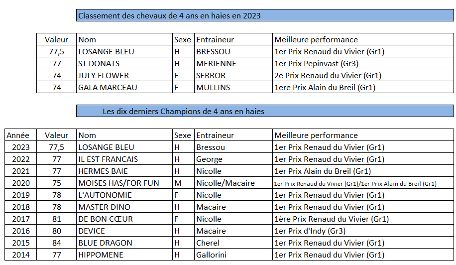 Losange Bleu arrive en tête. Il s’est offert avec brio le Prix Renaud du Vivier (Gr1) et s’est vu attribuer une valeur de 77,5. Elu meilleur 3 ans sur les haies l’an passé, le lauréat du Prix Pepinvast (Gr3) à la manière des forts, St Donats arrive en deuxième position de ce classement avec un rating de 77. Ce jour-là, il devançait Losange Bleu. La lauréate du Prix Alain du Breil (Gr1) Gala Marceau et July Flower 2e du Prix Renaud du Vivier (Gr1), créditées toutes deux d’une valeur de 74, viennent ensuite.