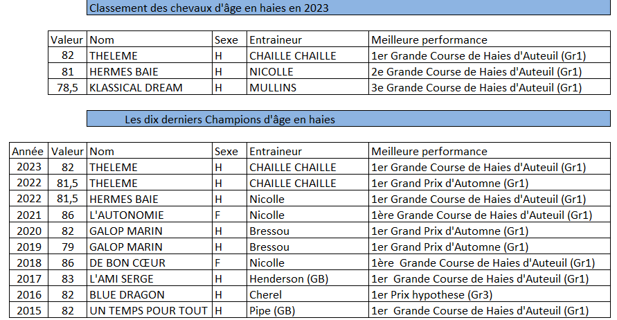Meilleur 5 ans sur les balais l’an passé, le pensionnaire d’Arnaud Chaillé Chaillé, Theleme, a dominé la catégorie des chevaux d’âge grâce à ses magnifiques victoires dans la Grande Course de Haies d’Auteuil (Gr1) et dans le Grand Prix d’Automne (Gr1). Dans ces deux épreuves phares, Il réalisait un rating de 82. Excellent également l’an passé, Hermes Baie, arrivé deuxième de la Grande Course de Haies d’Auteuil (Gr1), vient ensuite avec un rating de 81. Enfin, Klassical Dream complète le podium avec un rating de 78.5 obtenu grâce à sa 3e place dans la Grande Course de Haies d’Auteuil (Gr1).