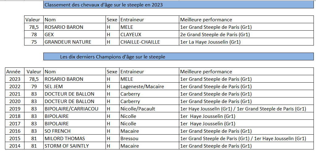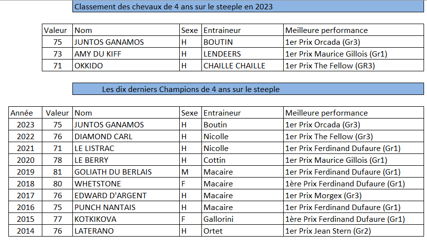 Juntos Ganamos est élu meilleur 4 ans sur le steeple. Lors de son succès dans le Prix Orcada (Gr3), le vainqueur du Prix Ferdinand Dufaure (Gr1) réalisait sa meilleure performance de l’année avec un rating de 75. Amy du Kiff, avec une valeur de 73, est deuxième. Cette valeur a été obtenue lors de sa victoire dans le Prix Maurice Gillois (Gr1). À la suite de sa victoire dans le Prix The Fellow (Gr3), Okkido, avec un rating de 71, complète le podium