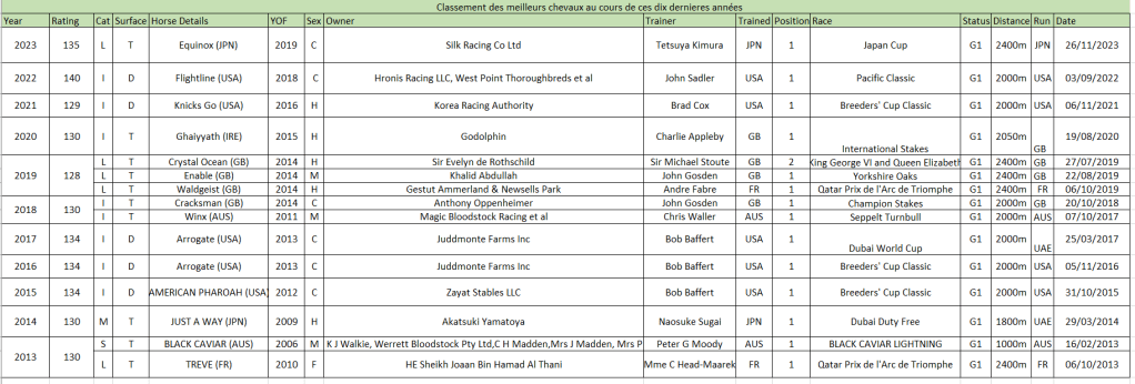 Classement des meilleurs chevaux au cours de ces 10 dernières années.
