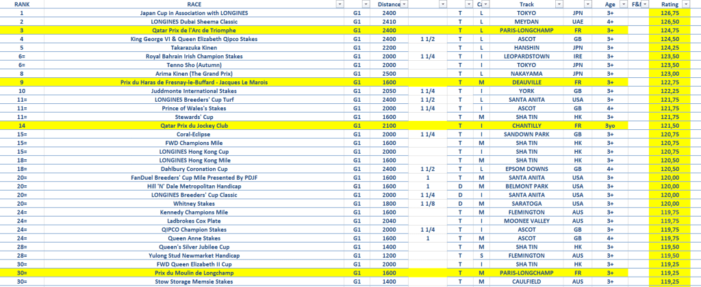 À noter que les quatre premiers du Qatar Prix du Jockey Club (Gr1) sont gagnants de groupe 1. Le deuxième BIG ROCK (rating de 127), est le vainqueur du Queen Elizabeth II Stake. Le troisième MARHABA YA SANAFI (rating de 115) est le lauréat de l’Emirates Poule d’Essai des Poulains. Enfin, le quatrième FEED THE FLAME (rating de 116) s’est imposé dans le Grand Prix de Paris. Ainsi au vu des performances des quatre premiers, cela fait du Qatar Prix du Jockey Club (Gr1) la meilleure course au monde pour 3 ans (rating de la course = 121.5).