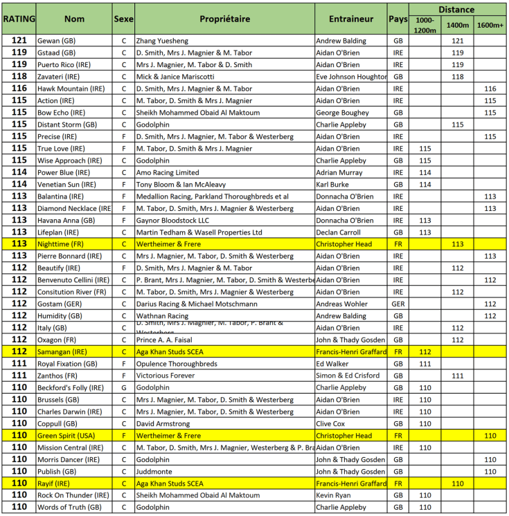 - GREEN SPIRIT, notée 110, est la meilleure pouliche française à la suite de sa deuxième place dans le Prix Marcel Boussac (Gr1).